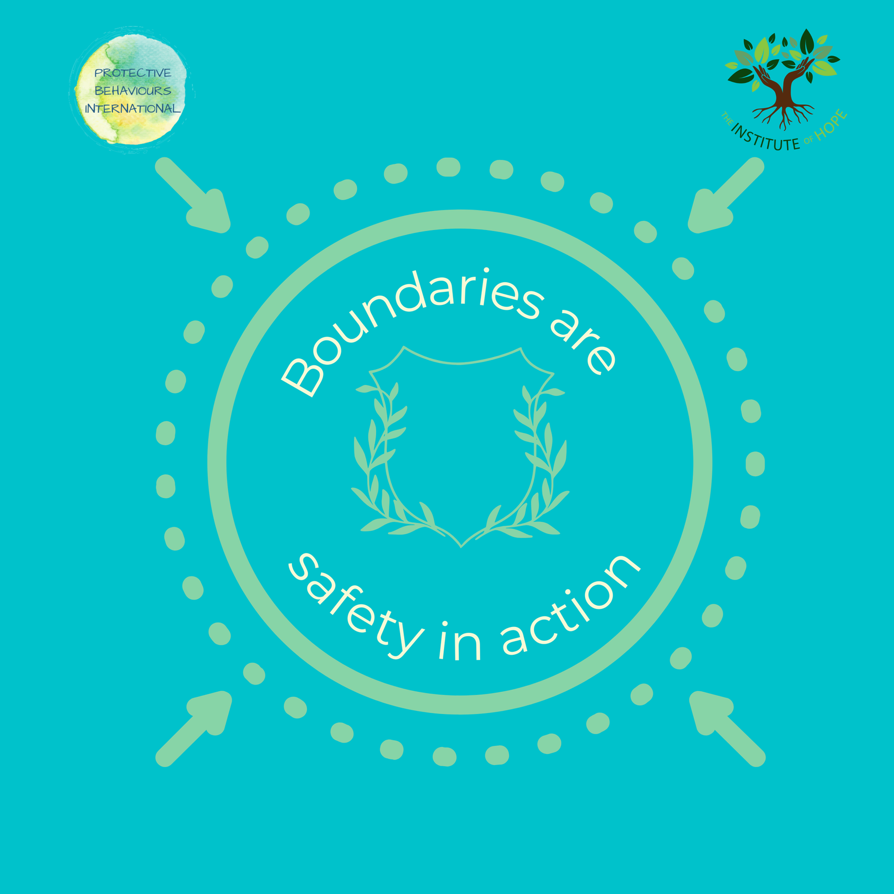 A teal background with a green circle with four arrows pointing towards it. The circle has a shield in the middle and text around it that reads: ‘boundaries are safety in action.’