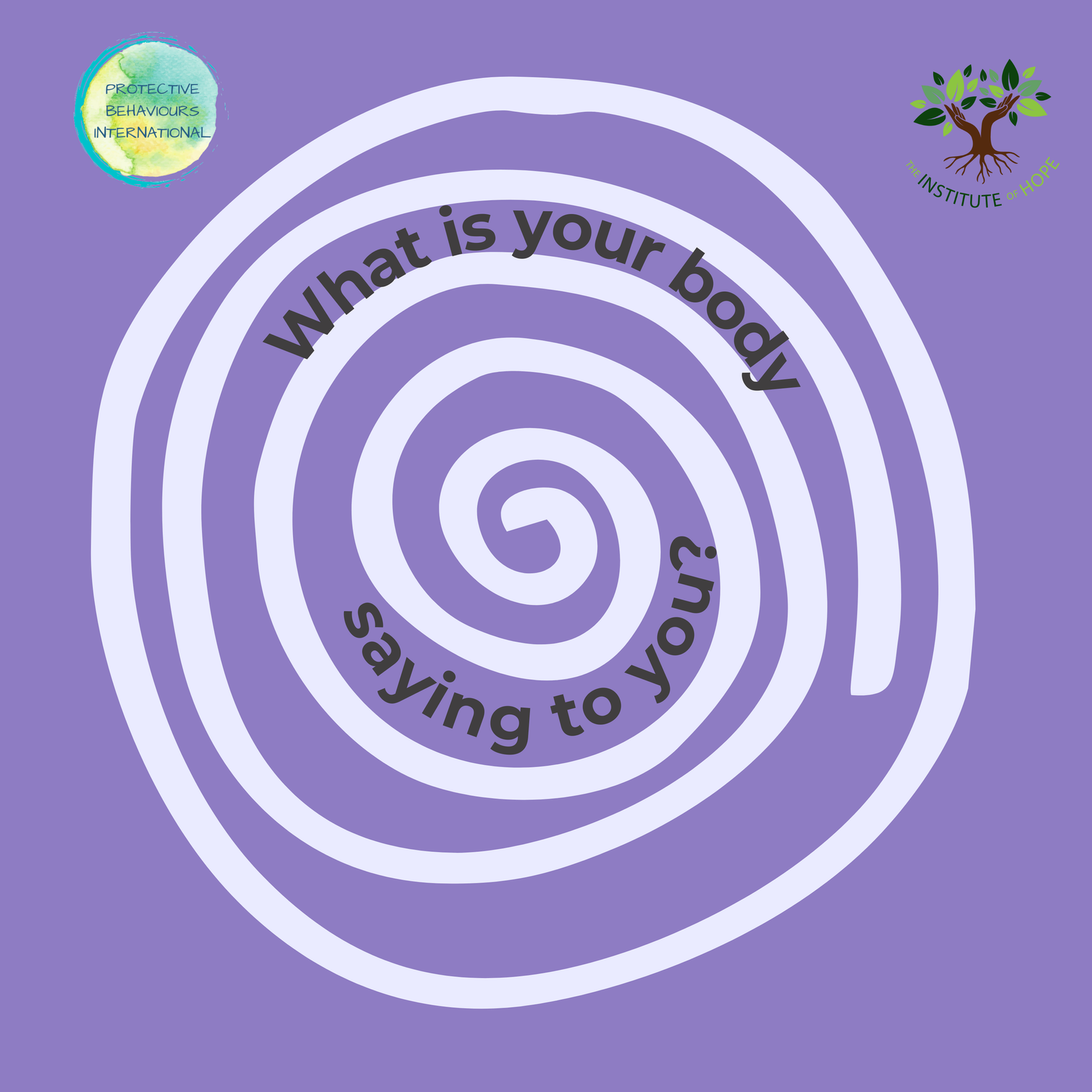 Purple graphic with a white spiral and the text ‘What is your body saying to you?’